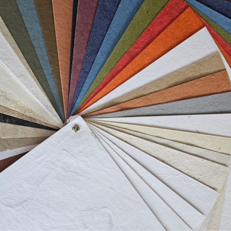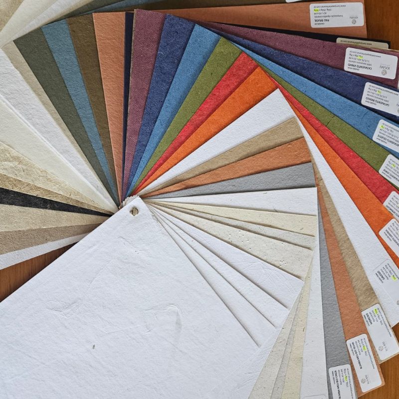 Mostruário dos papéis artesanais produzidos pela KAMI Papel Artesanal com todas as folhas em tamanho A4.