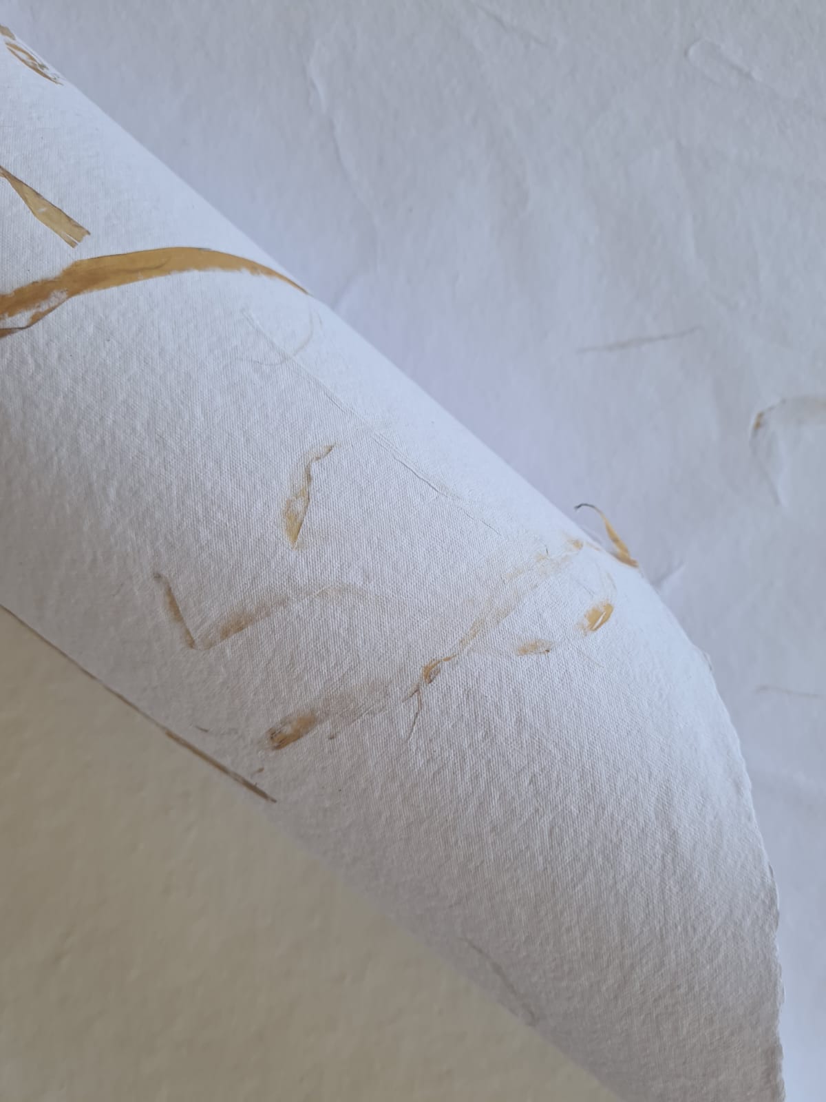 Papel artesanal feito a partir de reciclagem de apara industrial branca com acréscimo de folhas grandes de bambu dourado, em 150g e tamanho A2+ (63x45cm).