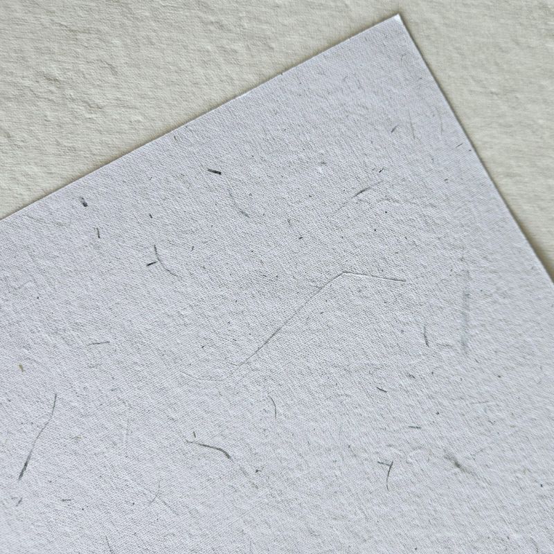 Papel artesanal feito a partir de reciclagem de apara industrial branca com acréscimo de pequenas folhas de bambu verde, em 150g e tamanho A4 refilado.