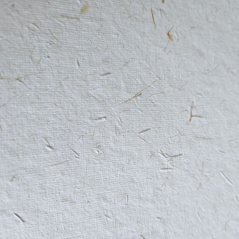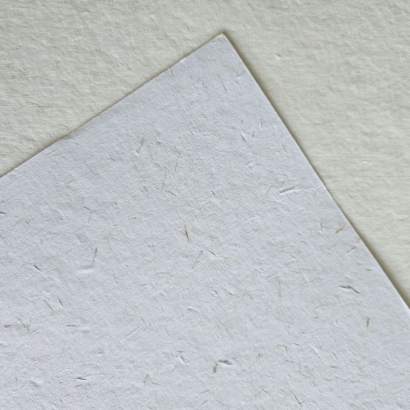Papel artesanal feito a partir de reciclagem de apara industrial branca com acréscimo de napie, em 150g e tamanho A3 refilado.